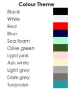 Black, white ,grey , red,dark grey, sea foam , turquoise, olive |
